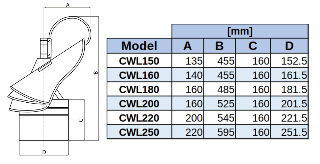 CWL250 – Otáčivá komínová čepice navržená k ochraně komína před nepříznivými povětrnostními podmínkami a zlepšení účinnosti tahu s možností otáčení 360°.