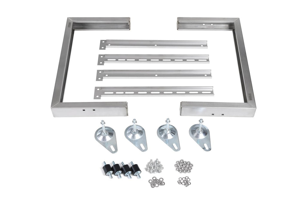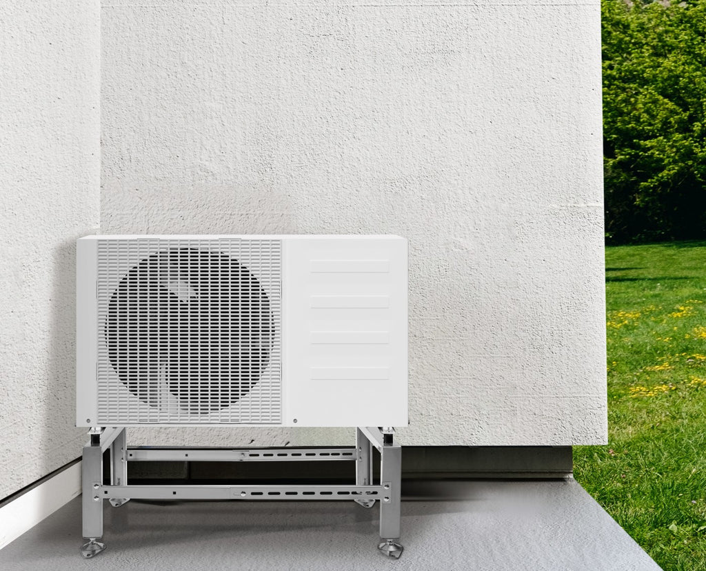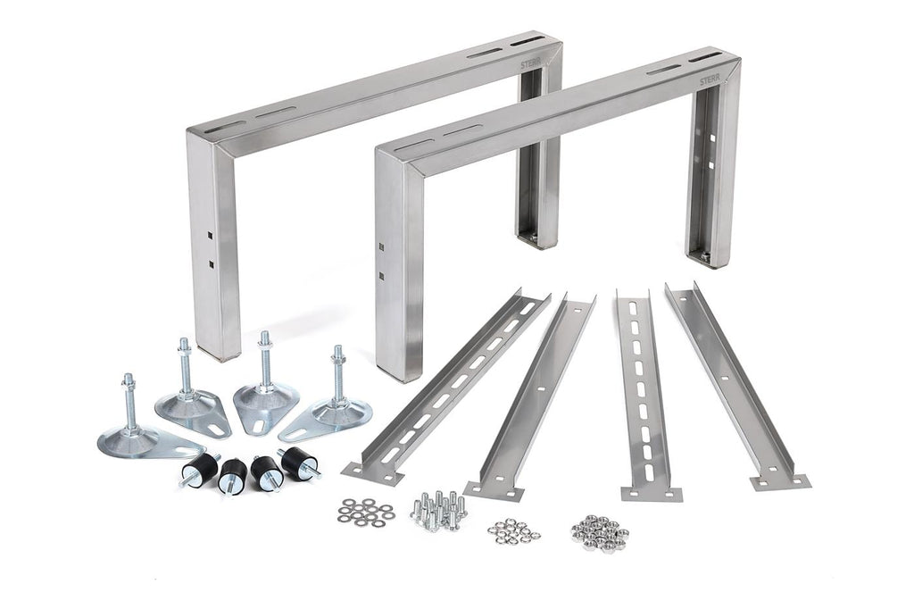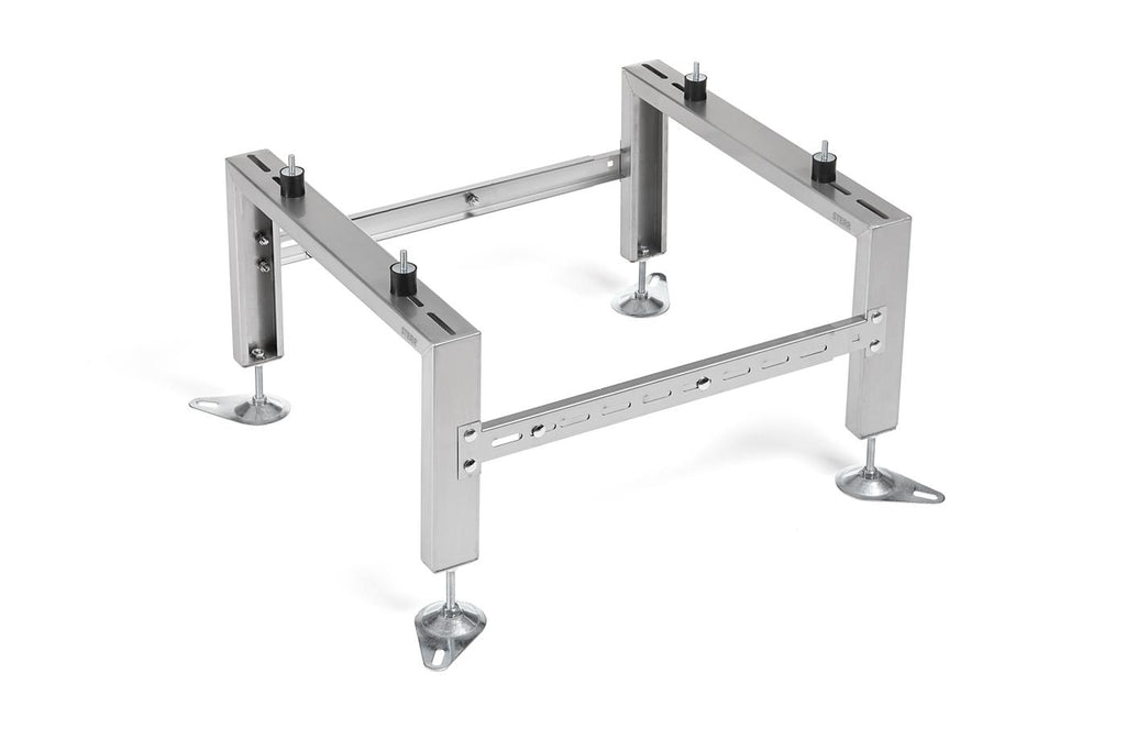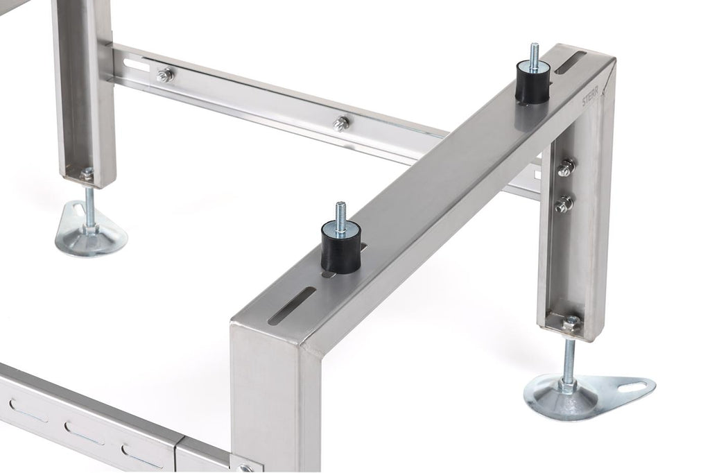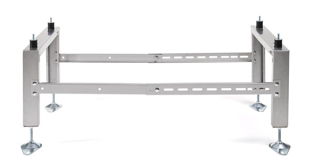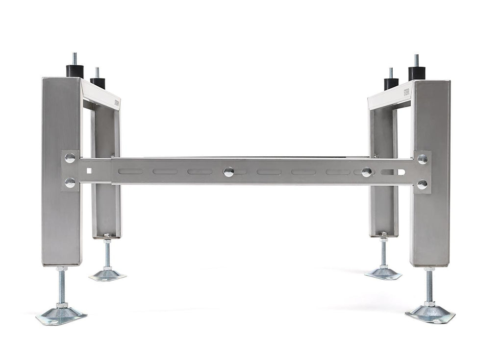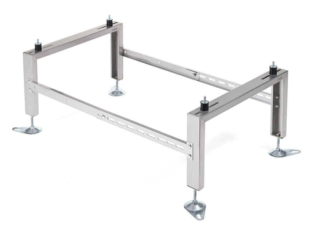 HSA500 – Profesionální podlahový stojan pro klimatizaci nebo tepelné čerpadlo s nastavitelnými rozměry (délka 600-1040 mm, šířka 560 mm, celková výška 300 mm + 90 mm nohy, šířka instalace 280-535 mm, hloubka instalace 540-975 mm) a impozantní nosností až 500 kg (materiálové testy ukazují až 700 kg). Vyrobeno z vysoce kvalitní nerezové oceli tloušťky 2 mm (třída 304) zajišťující maximální stabilitu.